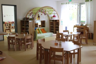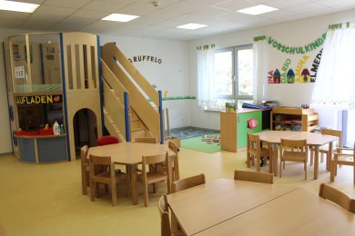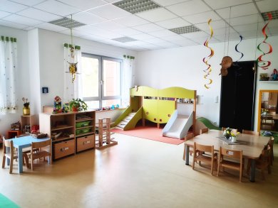 Die Kita verfügt über drei Gruppenräume. Zusätzlich verfügt jede Gruppe über einen Nebenraum, der bei den Kleinsten als Schlafraum und bei den größeren Kindern als Funktionsraum genutzt wird. Ebenso hat jede Gruppe ein eigenes Kinderbad. Auch der Flur wird bei uns zum Spielen genutzt, zudem steht ein weiterer Funktionsraum, sowie ein großer Bewegungsraum zur Verfügung.