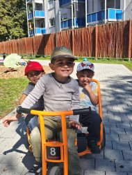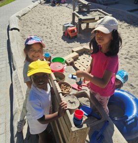 Ob Rutschen, Schaukeln, im Sandkasten spielen, oder sich mal richtig austoben – dafür bestehen bei uns die optimalen Bedingungen! Unser neues Klettergerüst lässt keine Wünsche offen um sich auszubprobieren. In unserer tollen Matschanlage haben die Kinder im Sommer die Möglichkeit zum Baden und zum Sandburgenbauen. Zusätzlich steht den Kindern eine große Auswahl an Fahrzeugen aller Art (Roller, Dreiräder, Taxis, Bobbycars, Fahrräder...) zur Verfügung. Die Reckstangen, Bewegungskreisel, Tonnen und Sandspielsachen runden das Angebot ab.