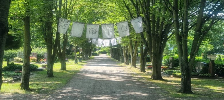 Auf der Plauderbank an der Friedshofsallee bei den Religionsfahnen können Interessierte gemeinsam mit der Gemeindeschwester über die Themen Geburt, Leben, Sterben, Tod und Trauer sprechen.