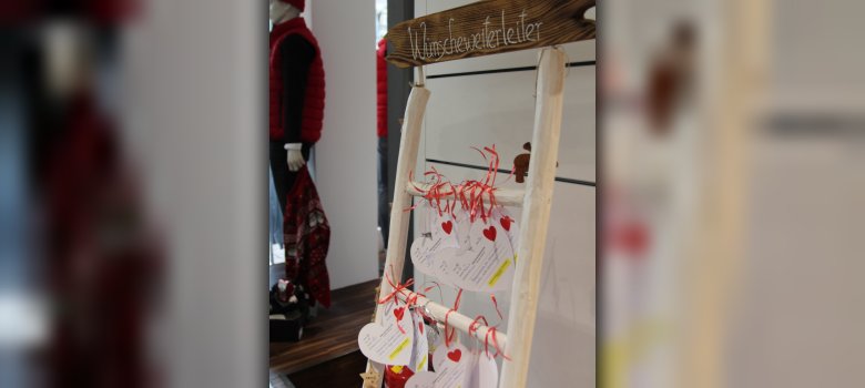 Die festlich geschmückte Wünsche(weiter)leiter wird heute, am 1. Dezember 2025, im Modehaus Schmitt aufgestellt. Dank der erneuten Kooperation mit Inhaber Michael Schmitt können dort ab sofort die Wunschkarten der Kinder entdeckt werden. Jede Karte enthält einen Herzenswunsch im Wert von bis zu 30 Euro – sorgfältig von den Kindern notiert und bereit, von unterstützenden Bürger*innen erfüllt zu werden.